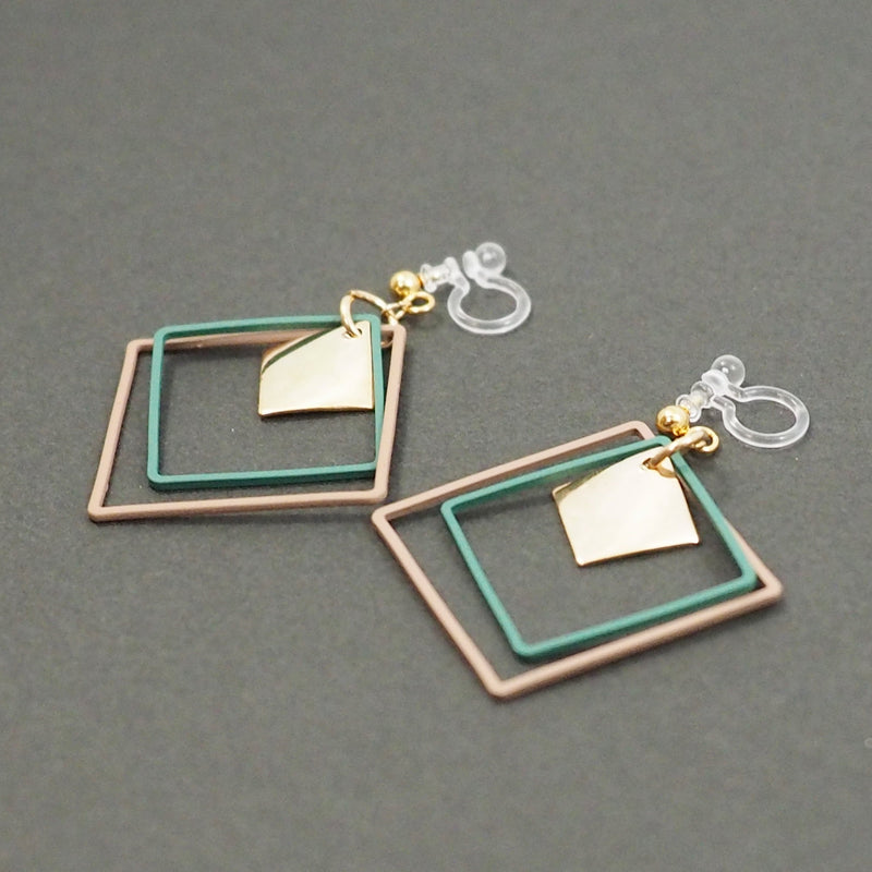 Green and Beige Square Hoop Invisible Clip On Earrings