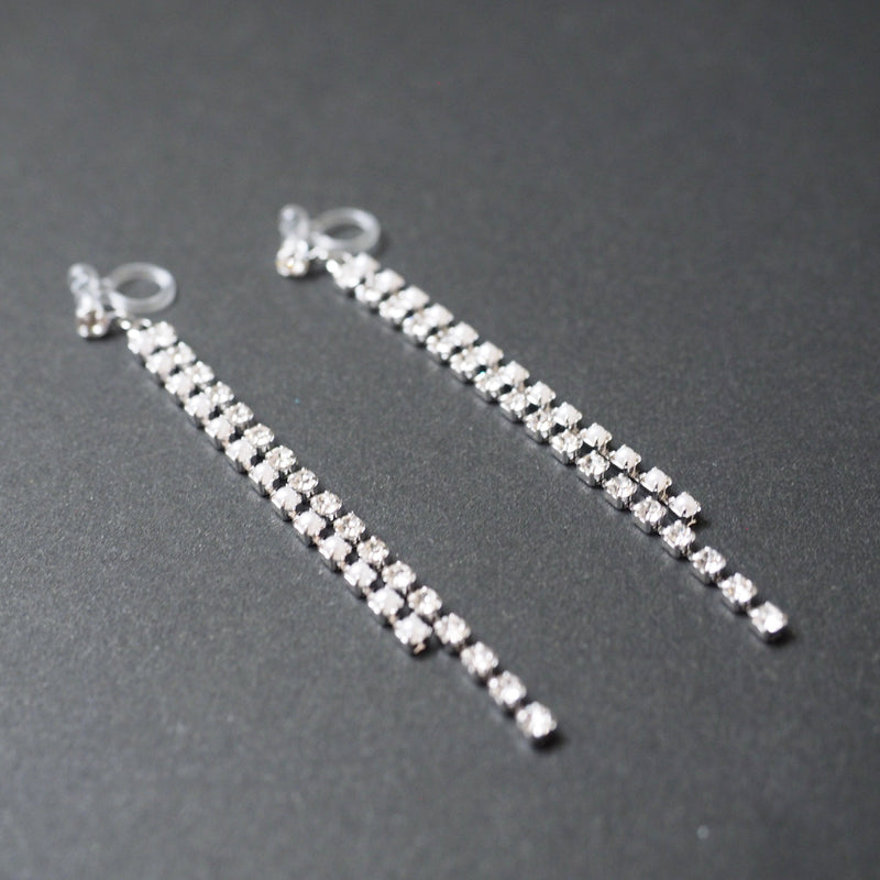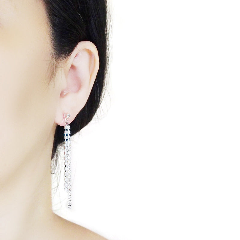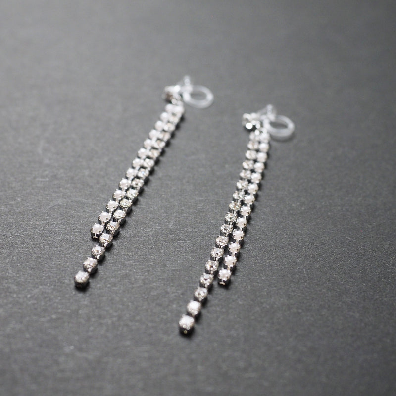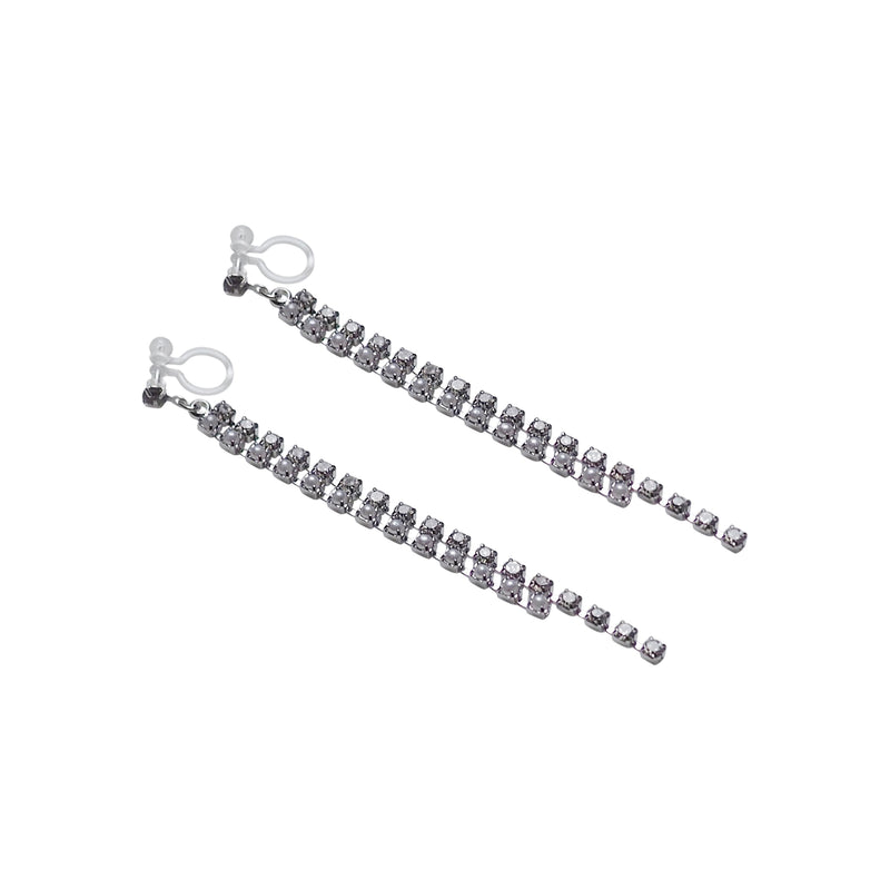 These are elegant long pearl and rhinestone crystal chain invisible clip on earrings. They dangle elegantly and shimmer a lot. These invisible clip on earrings are suited for daily wearing, wedding, date, prom, or any occasions you want to be more charming and get more compliments. They are versatile! And the net weight of these earrings is only 2.4 g and these are lightweight! You will be free from the pinching pain! Why don’t you add these trendy invisible clip on earrings to your wardrobes?